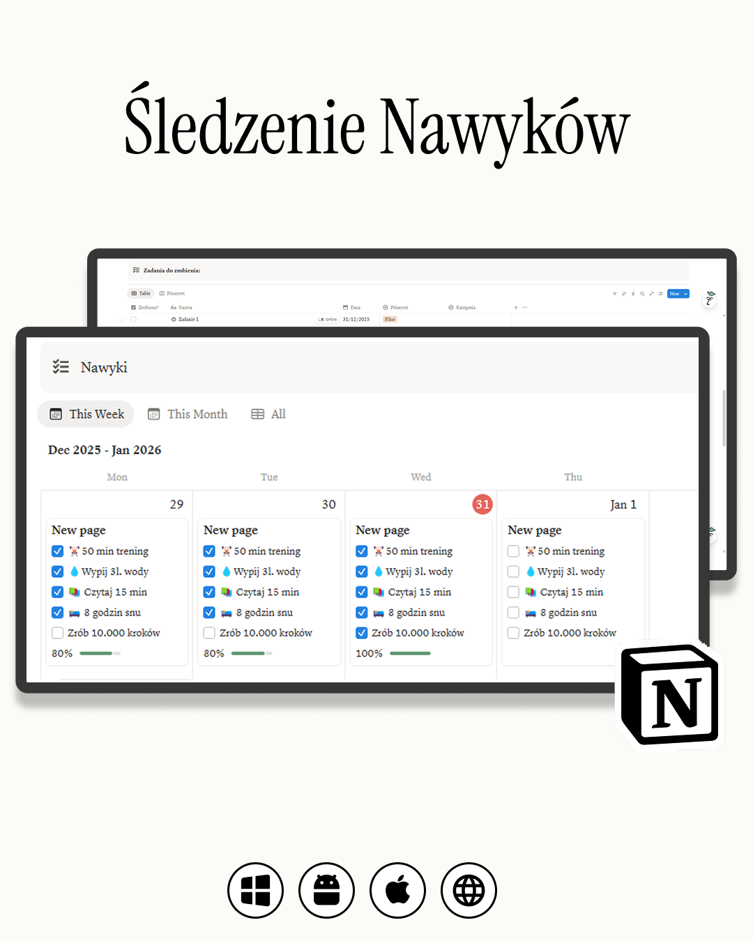 Notion działa na wszystkim! Możesz korzystać ze swojego plannera na komputerze (przeglądarka lub aplikacja desktopowa), tablecie oraz smartfonie (aplikacja iOS/Android).